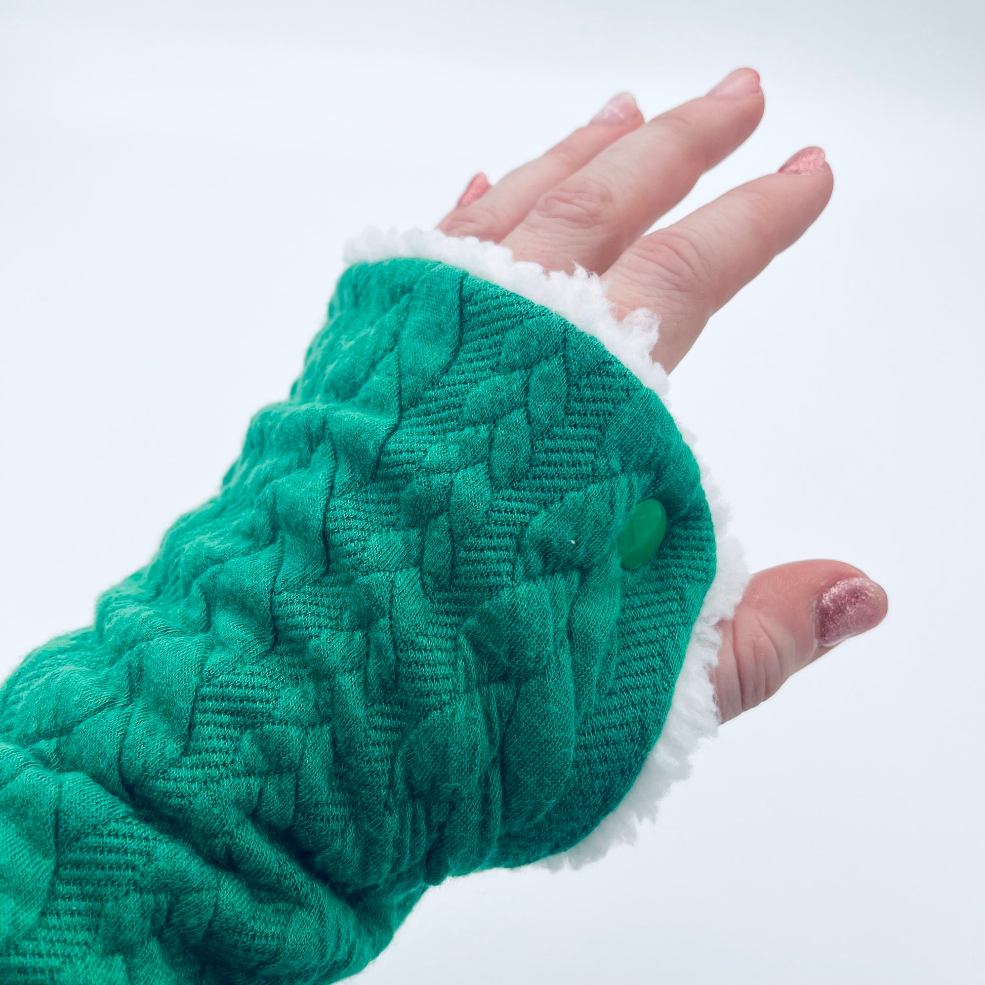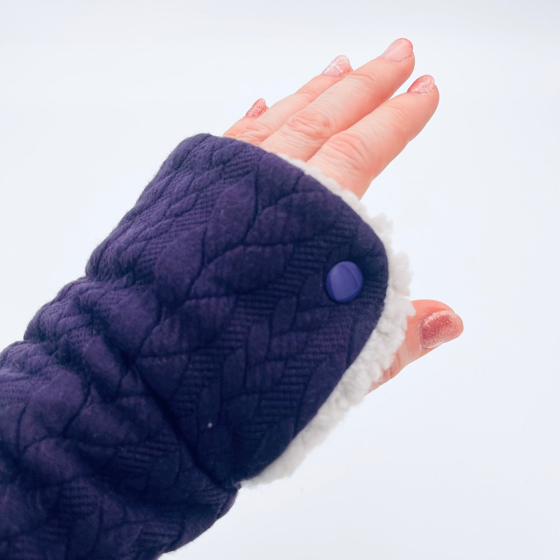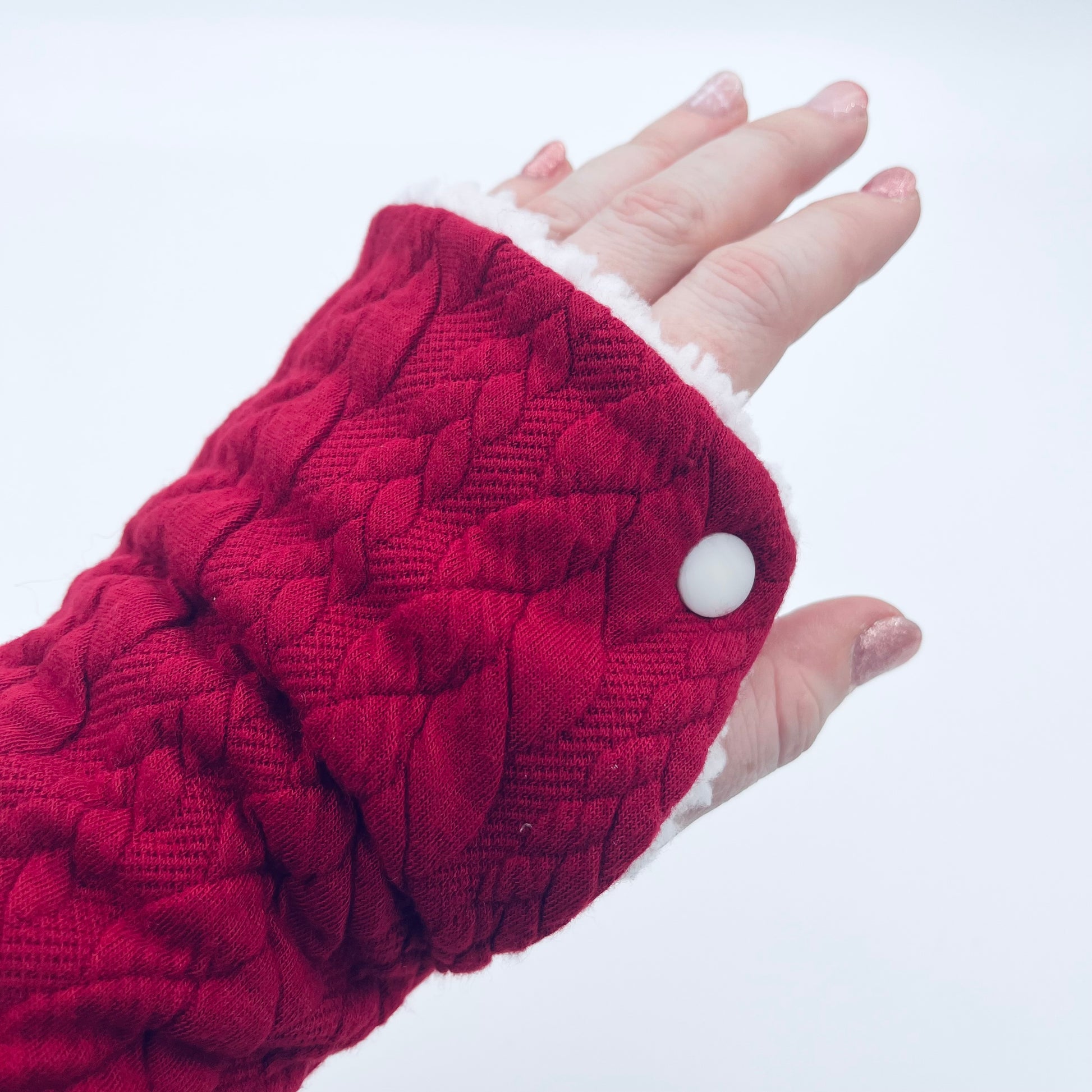 These wrist warmers are the perfect addition to any wardrobe when there's a chill in the air! Lined with super-soft teddy fleece, and with a choice of either viscose blend cable knit fabric or cotton jersey outer fabric, they are amazingly comfy to wear. They are cleverly finished with a press stud which allows you to fold the gloves back like cuffs if you need to wash your hands, eat, or do anything else requiring your whole hand, without the need to take the gloves off completely.