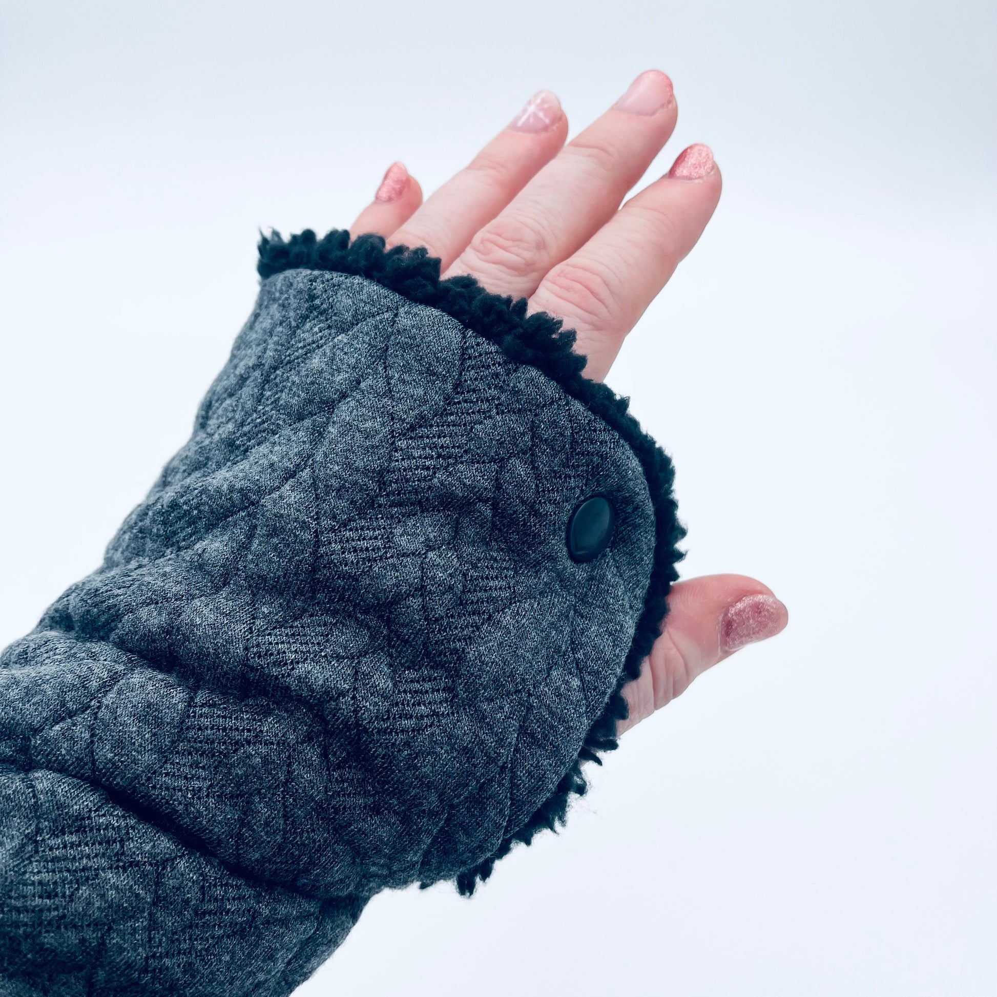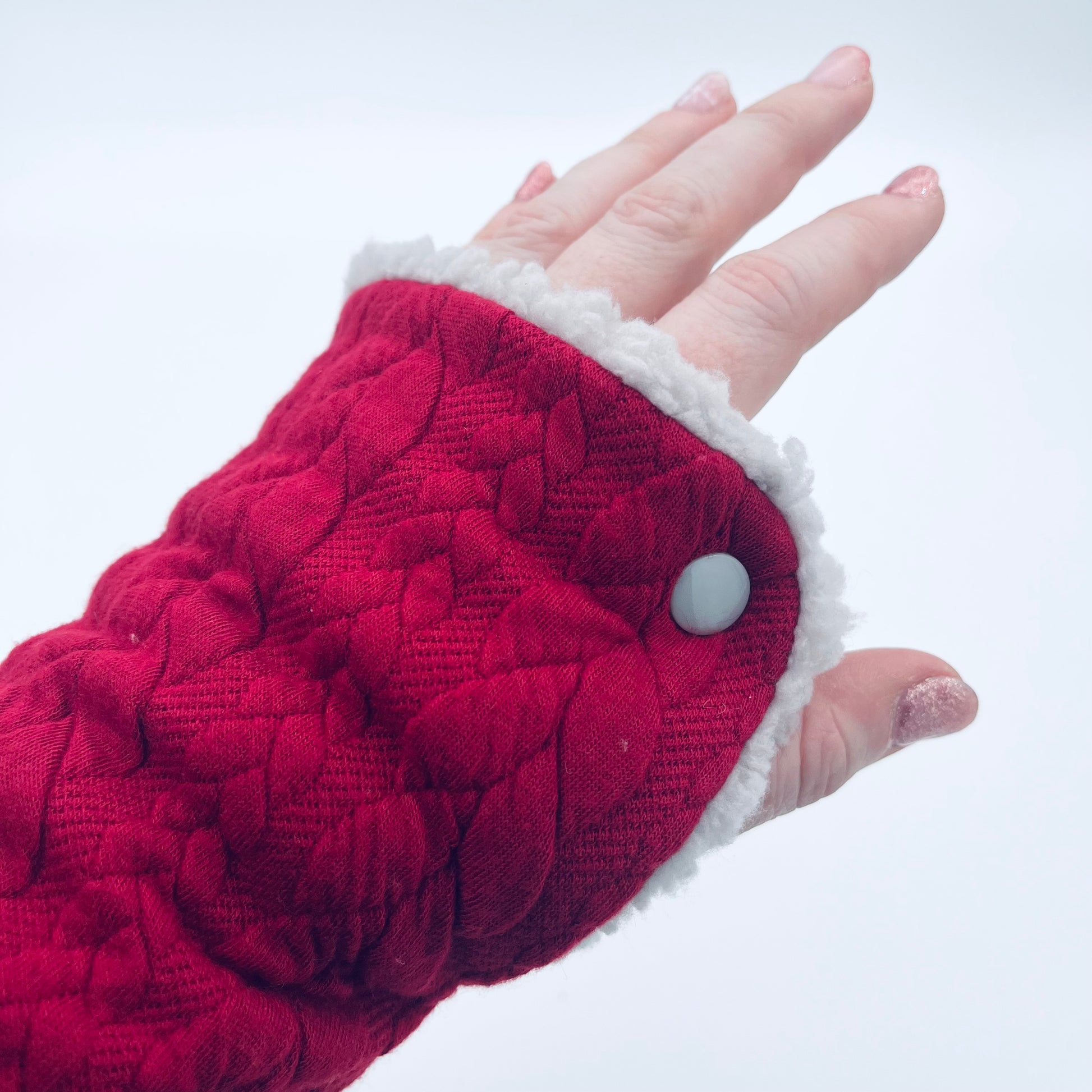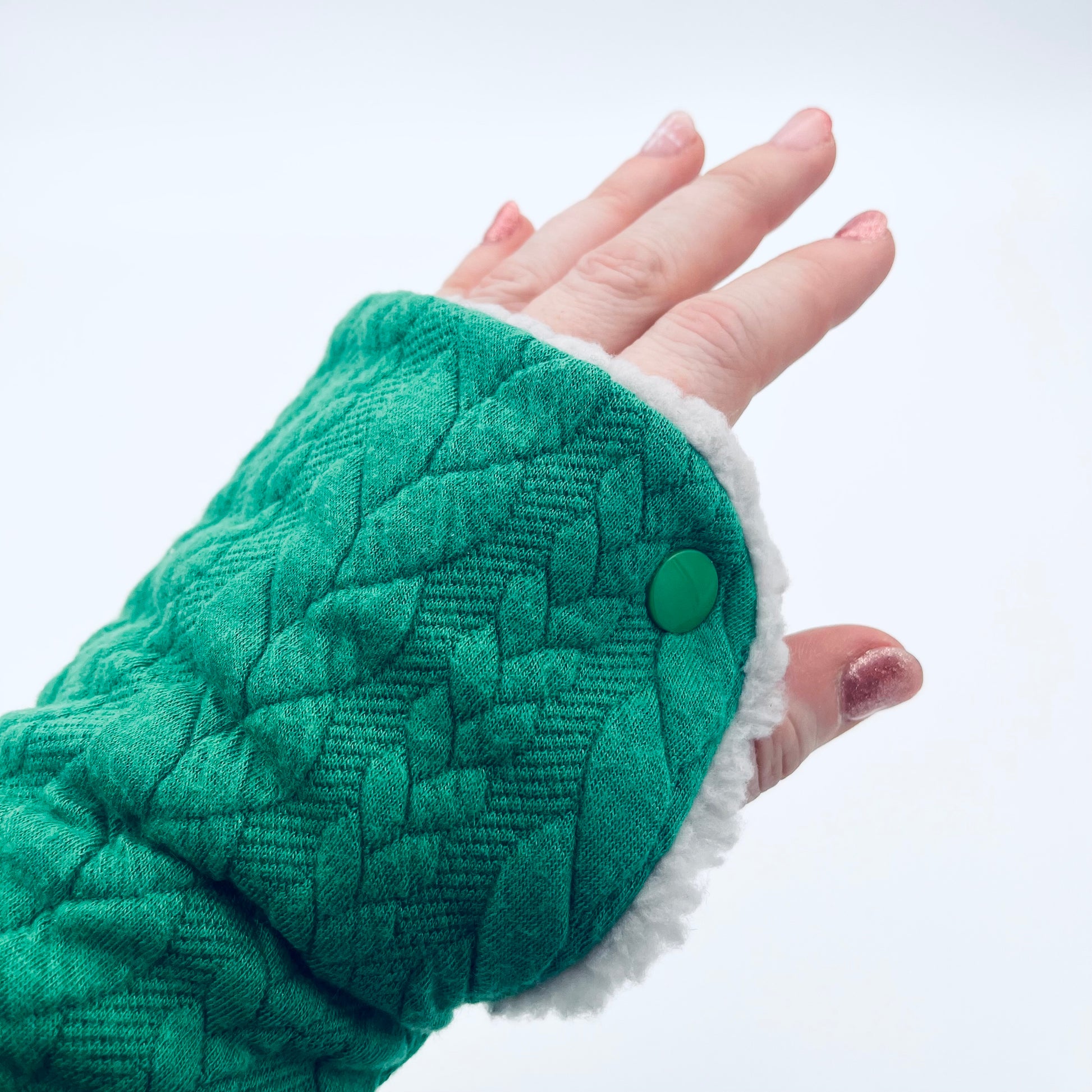 These wrist warmers are the perfect addition to any wardrobe when there's a chill in the air! Lined with super-soft teddy fleece, and with a choice of either viscose blend cable knit fabric or cotton jersey outer fabric, they are amazingly comfy to wear. They are cleverly finished with a press stud which allows you to fold the gloves back like cuffs if you need to wash your hands, eat, or do anything else requiring your whole hand, without the need to take the gloves off completely.